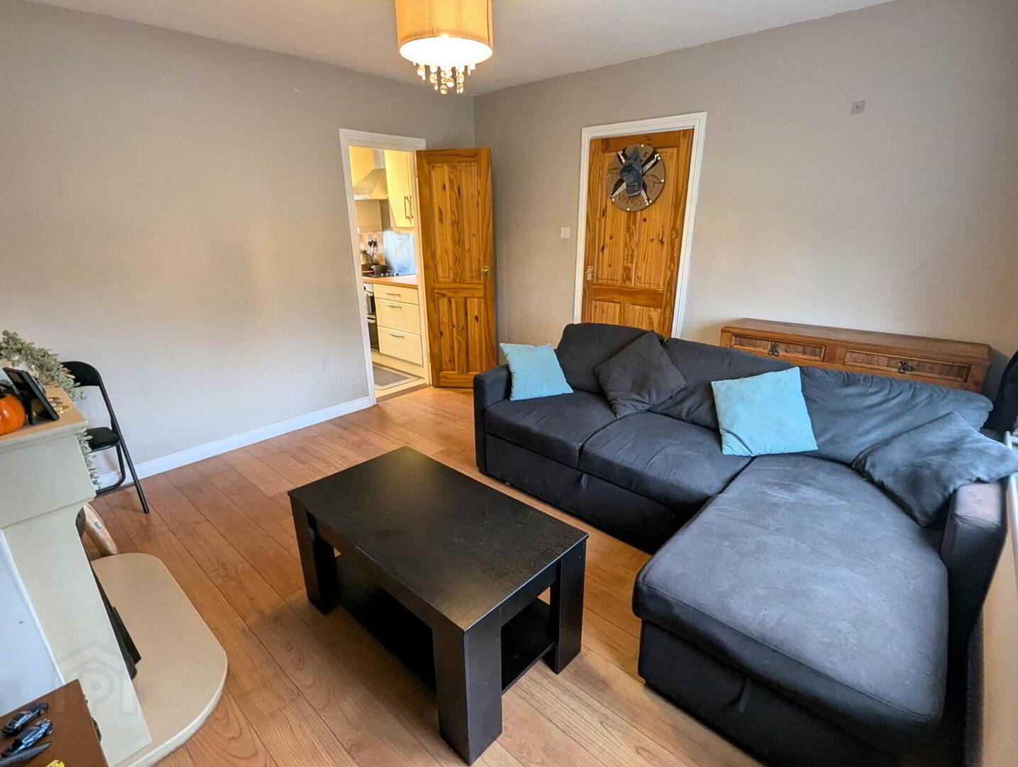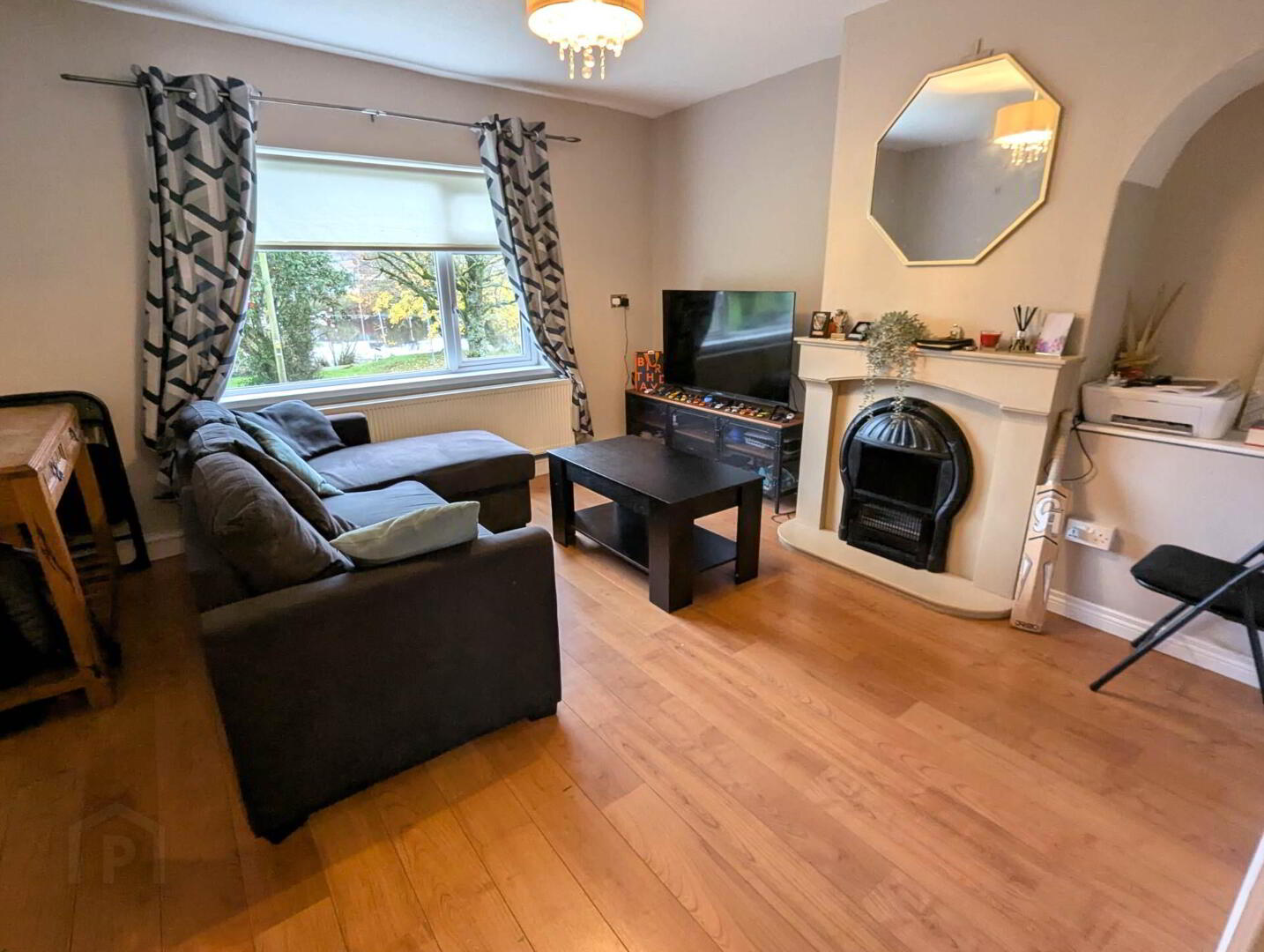Wooden flooring, pendant lights, fireplace, radiator, sockets