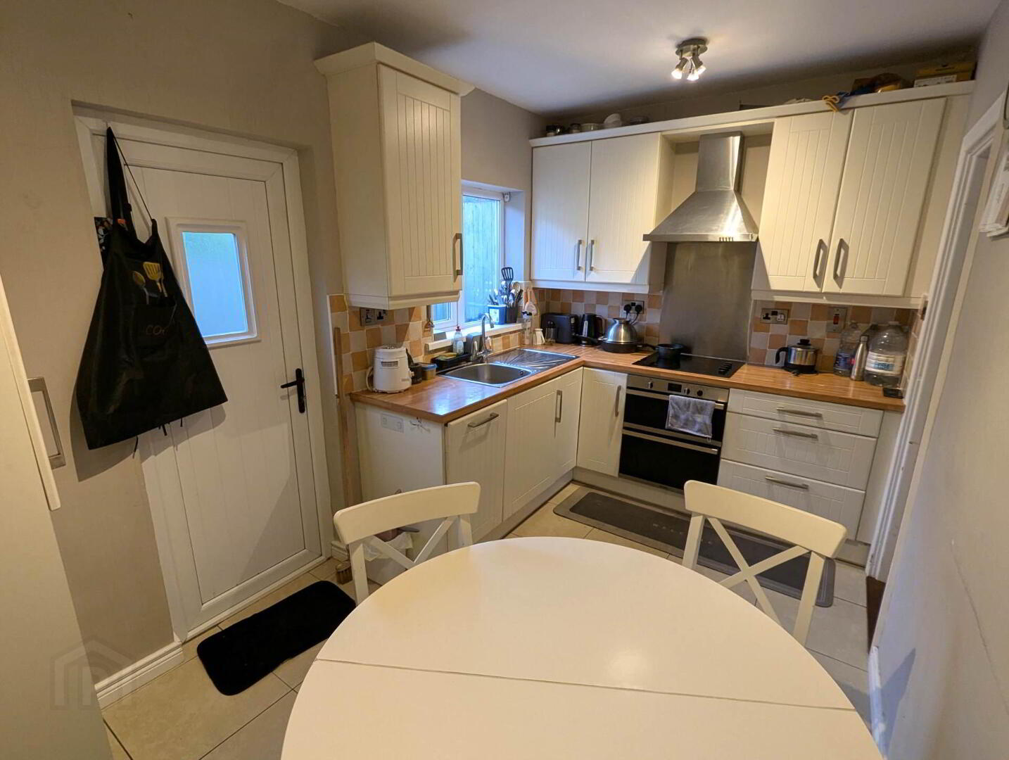 Tiled flooring, high and low level units, inset sink, oven and hob, sockets