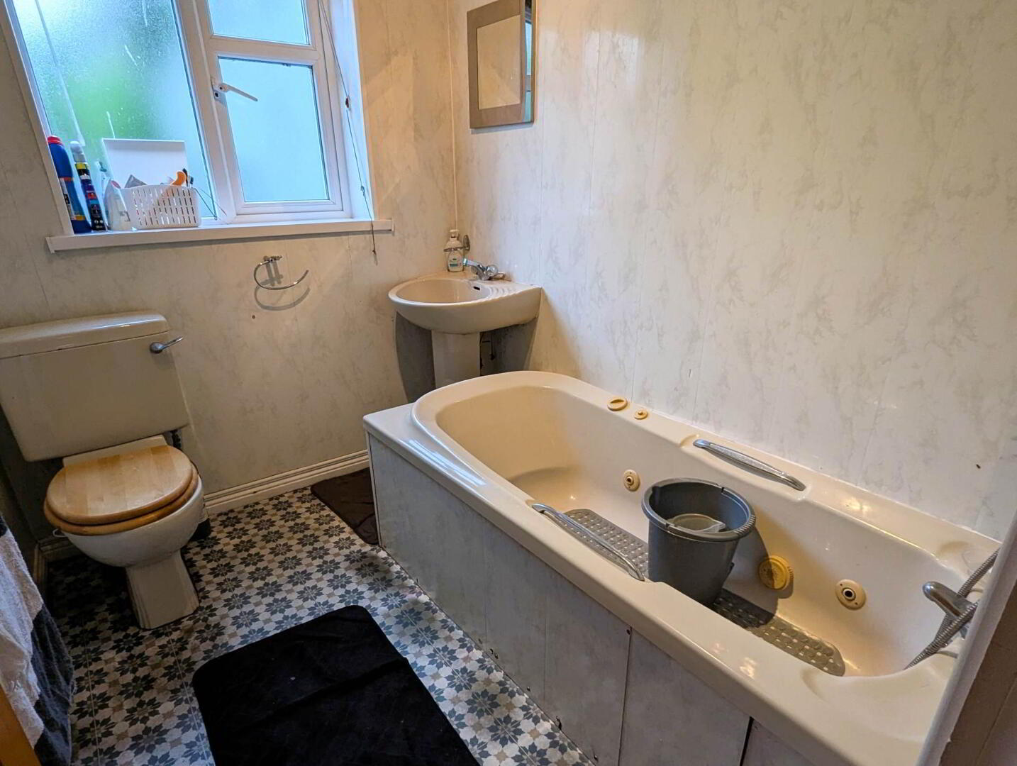 Tiled flooring, marble style walls, w/c, wash hand basin, bath/ shower