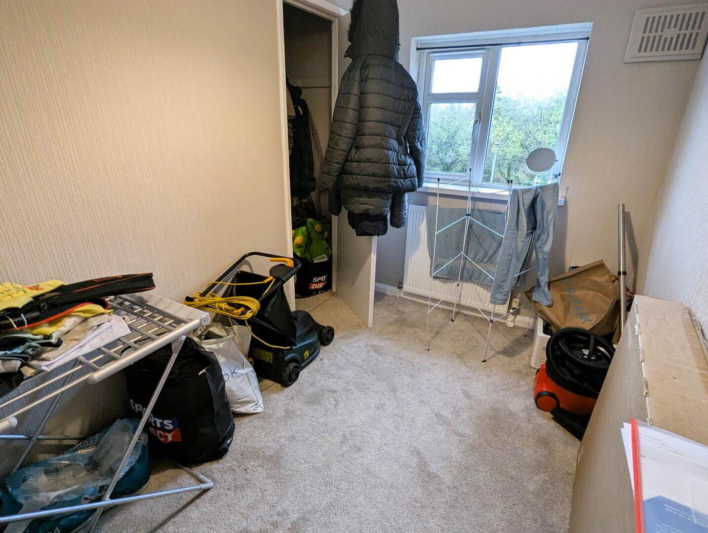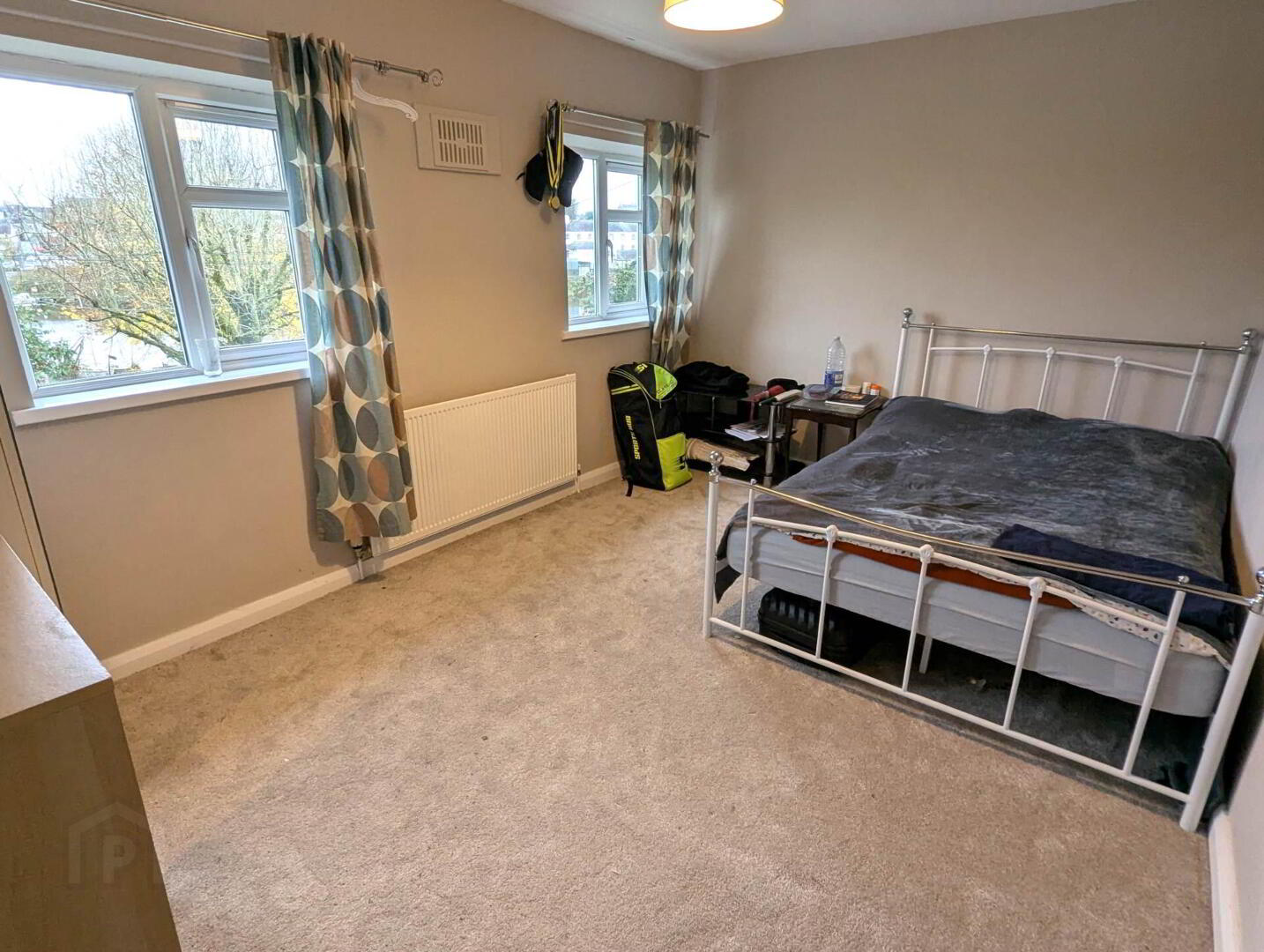 Carpet flooring, pendant light, radiator