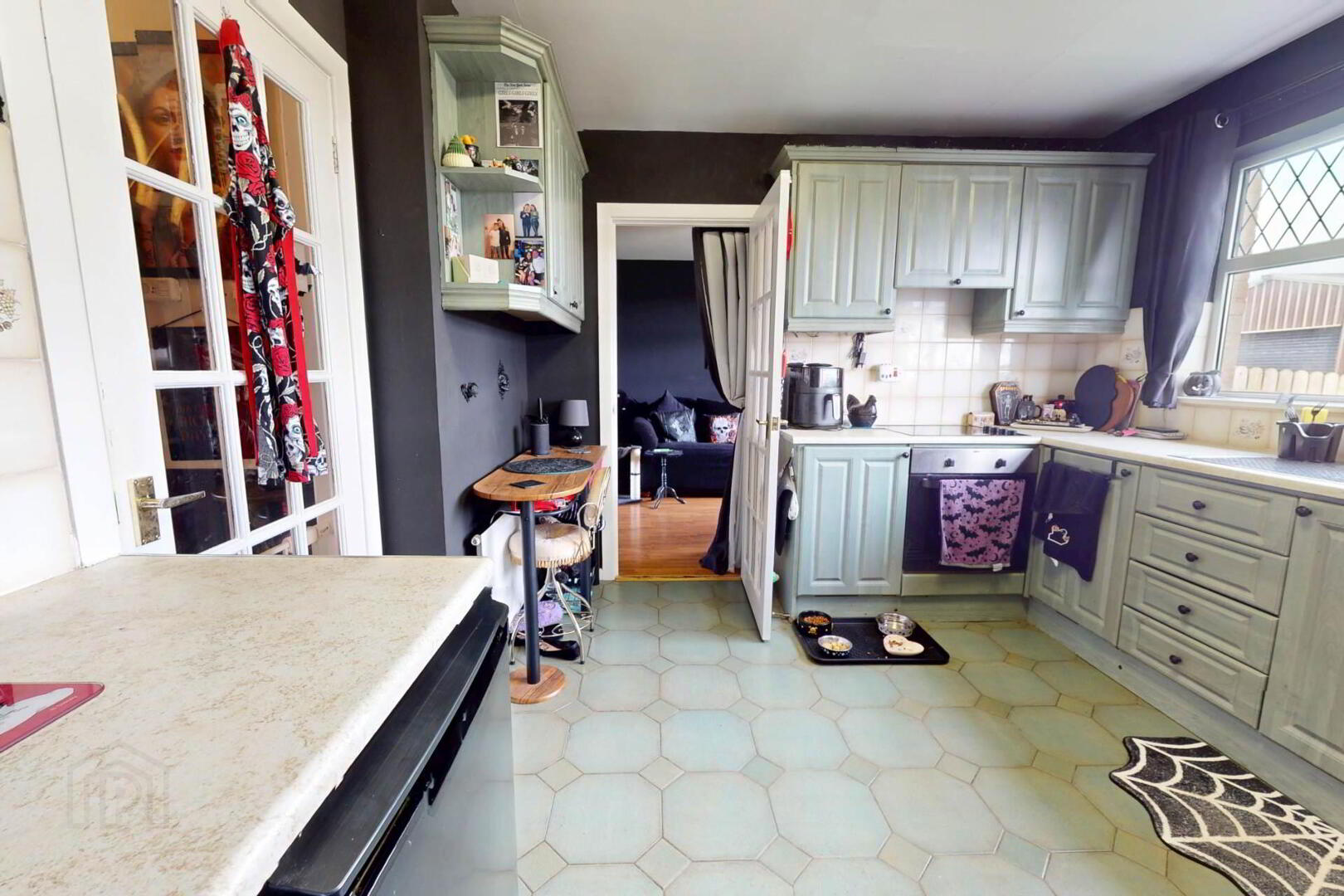 Tiled flooring; high & low level units; tiled splashback; integral electric hob & oven; extractor fan; stainless steel sink; patio door to rear garden