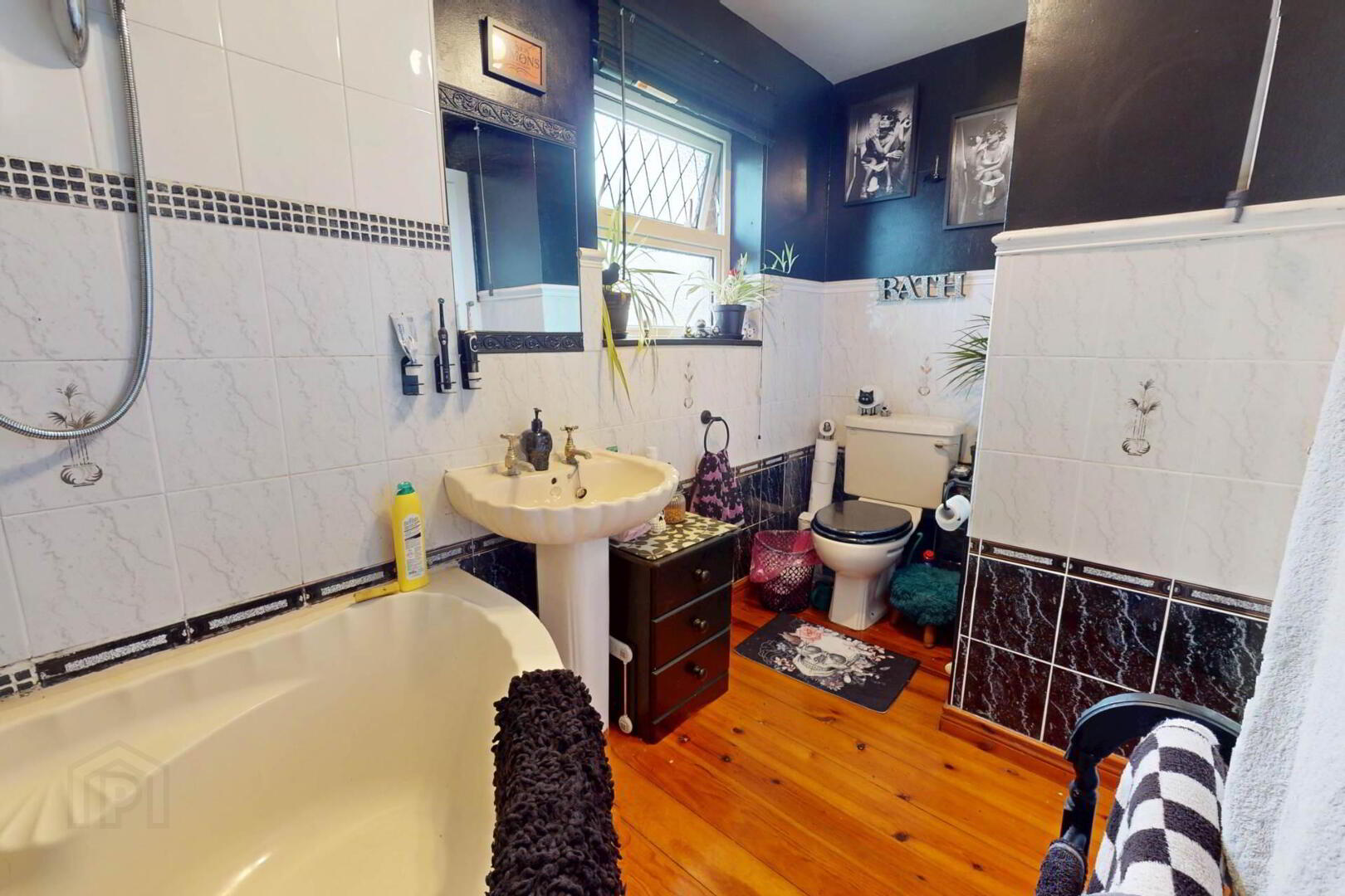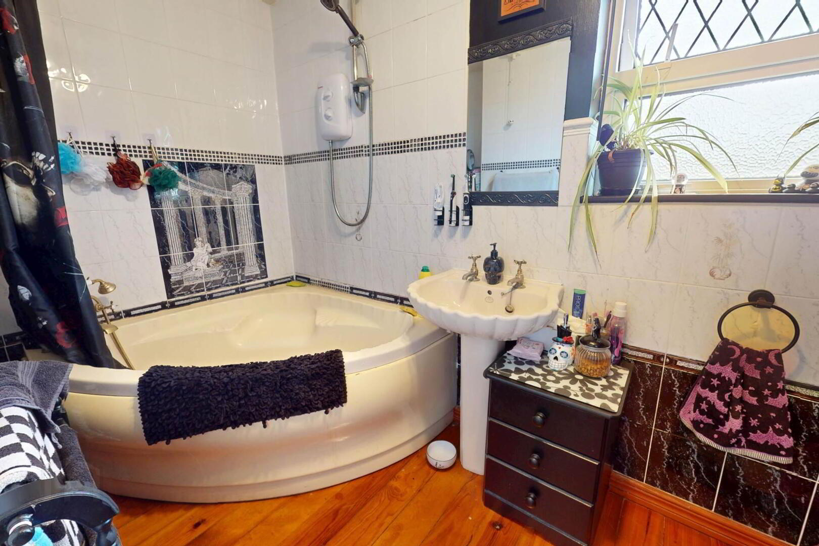 Wooden flooring; part tiled walls; electric shower over bath; WC; wash hand basin