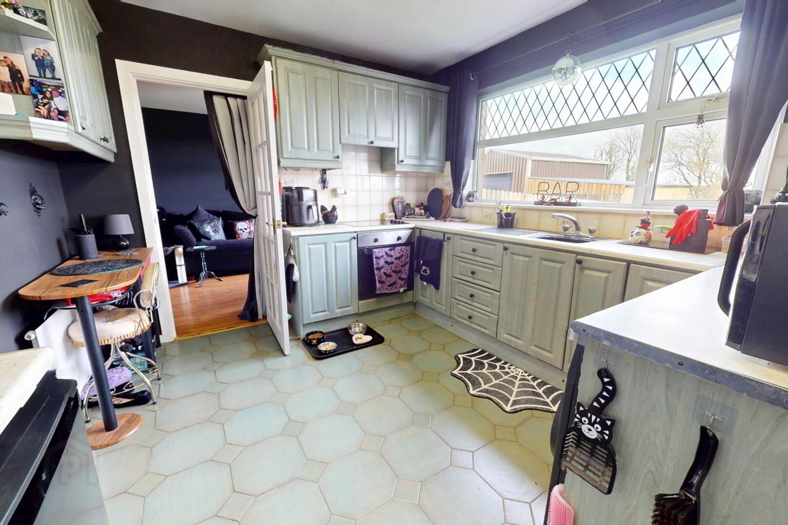 Tiled flooring; high & low level units; tiled splashback; integral electric hob & oven; extractor fan; stainless steel sink; patio door to rear garden
