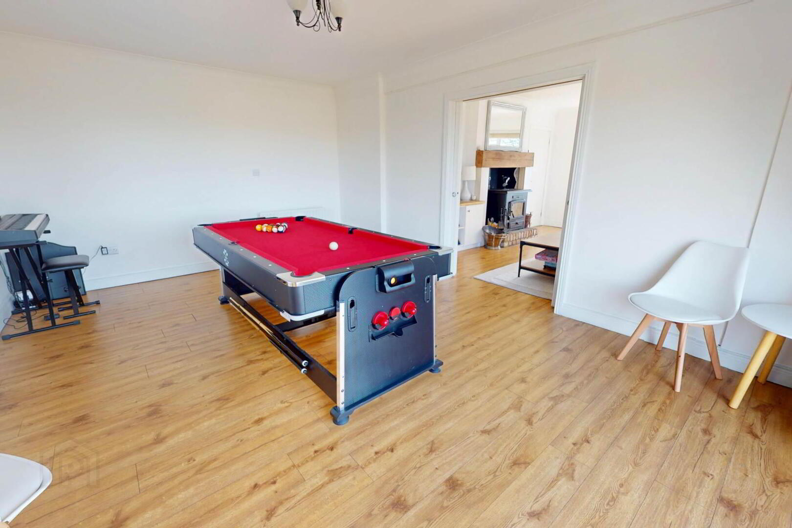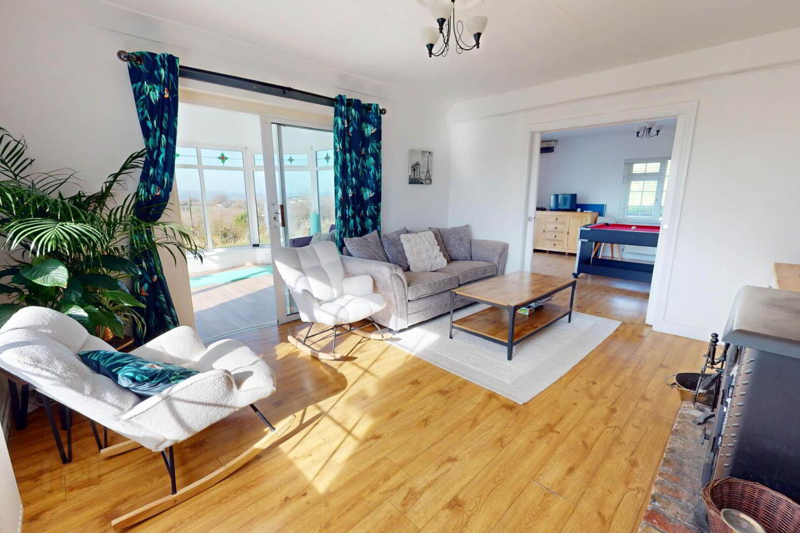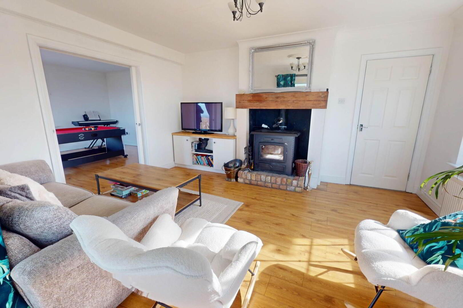 The ground floor centres around a comfortable sitting room with a back boiler stove, opening directly into a conservatory that captures the sun throughout the day. A further reception room provides flexible space for a playroom, office or second lounge, with sliding doors leading out to the garden.