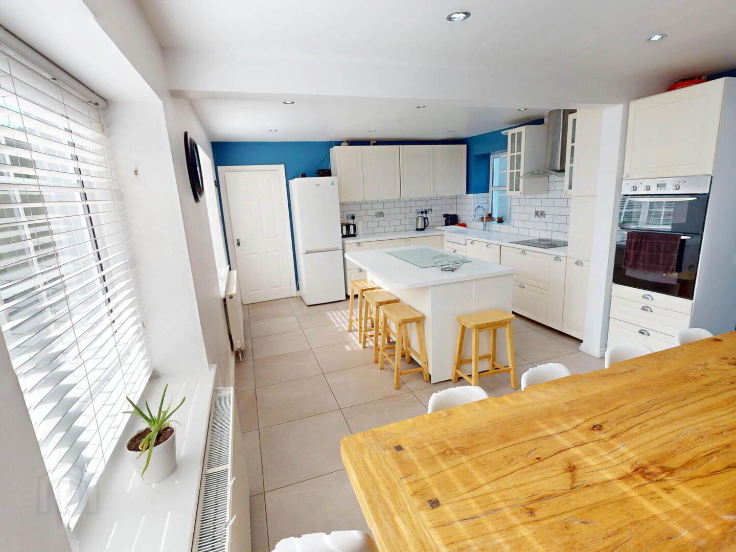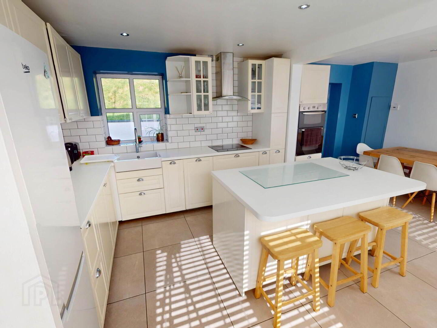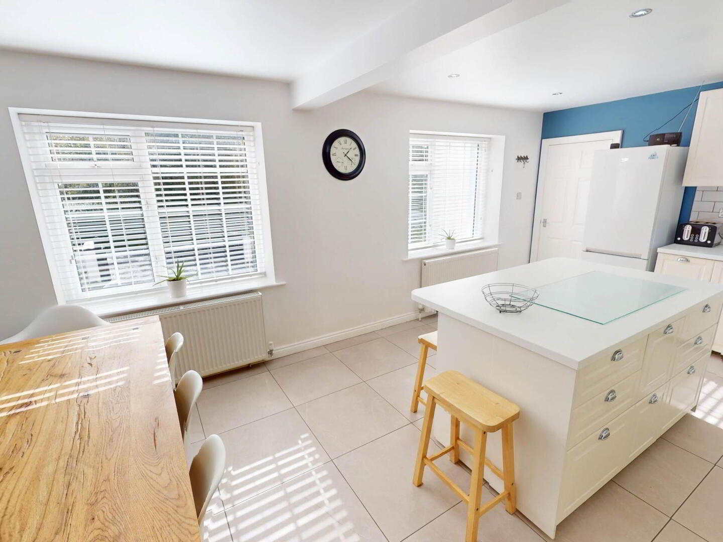 The kitchen/dining area is a standout feature fitted with an island, built in units and plenty of workspace, while a separate utility room links through to the garage. The ground floor is comptlete with a toilet.