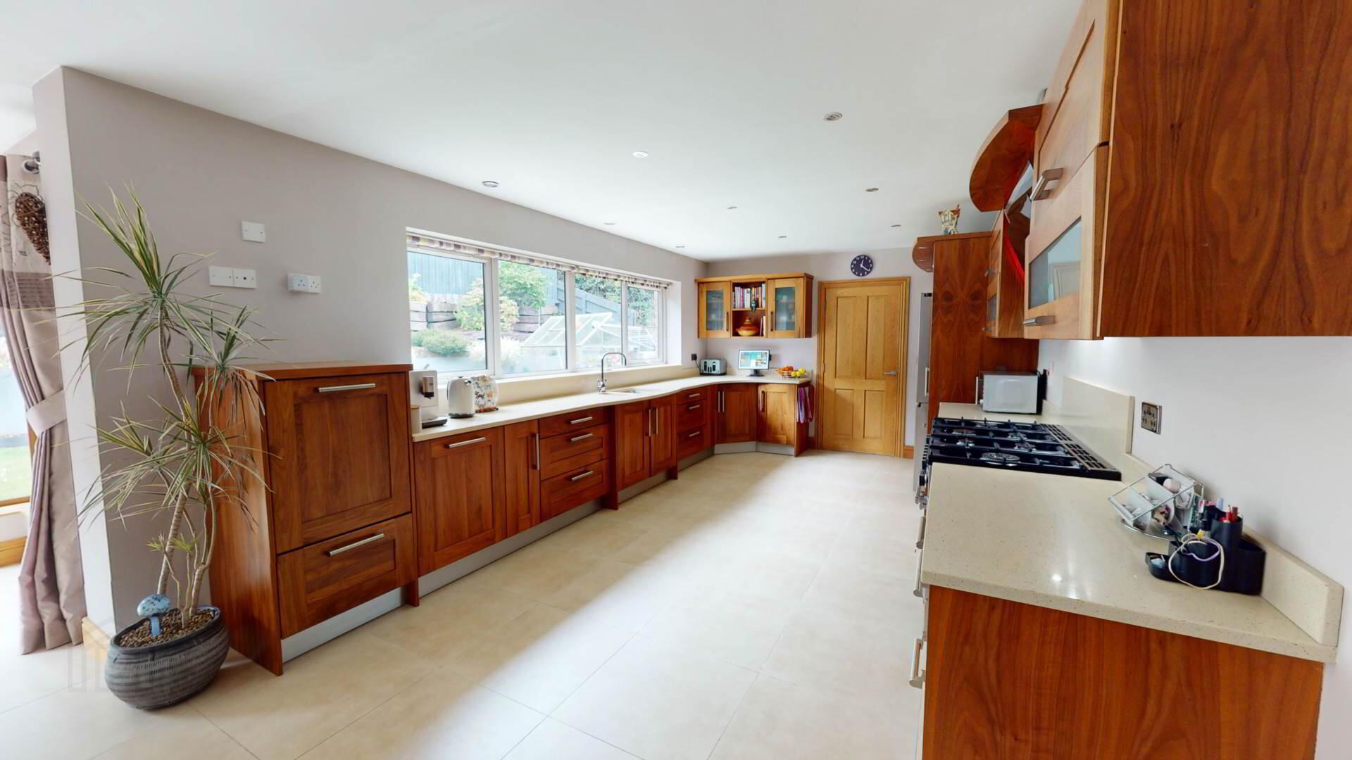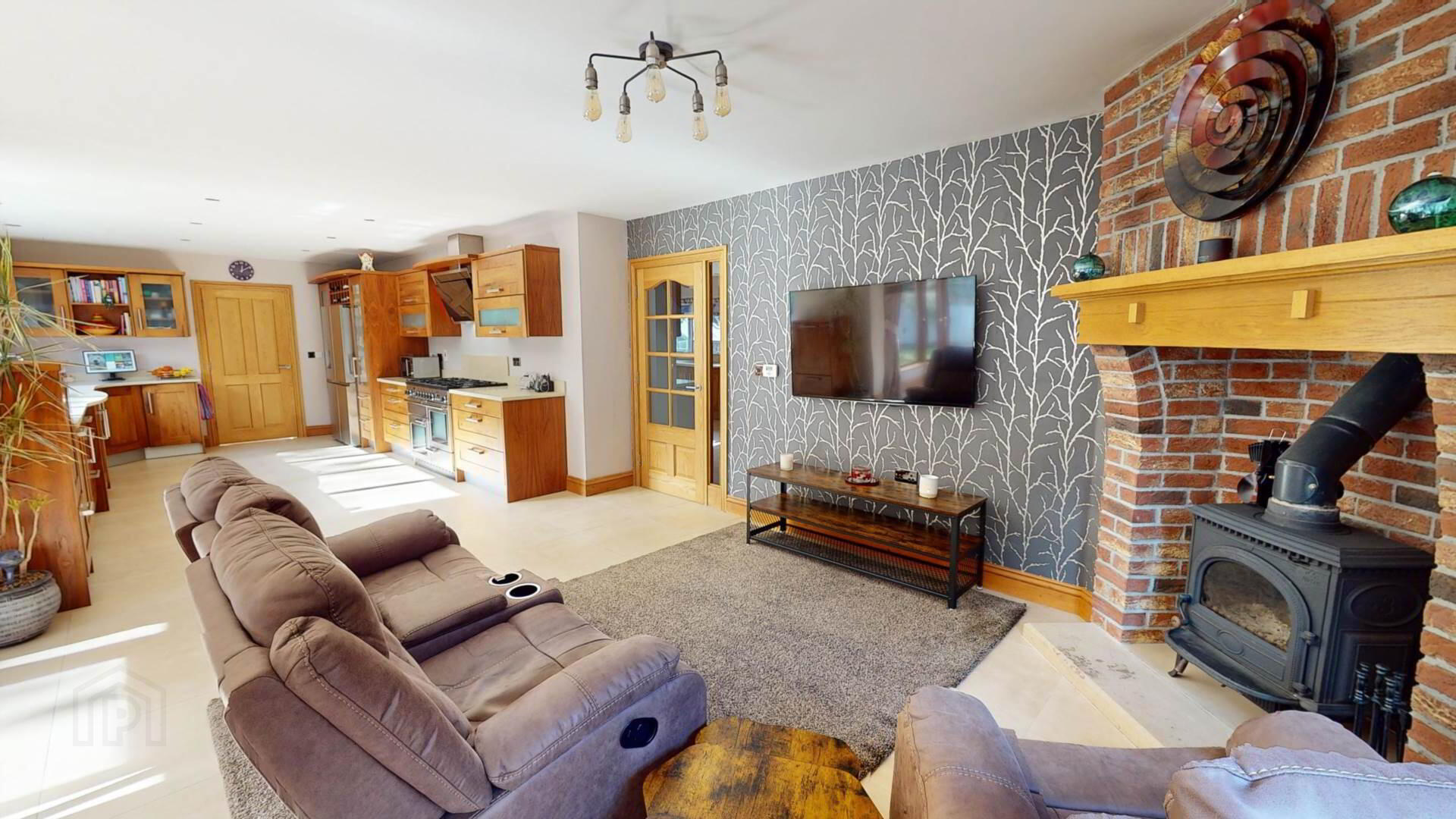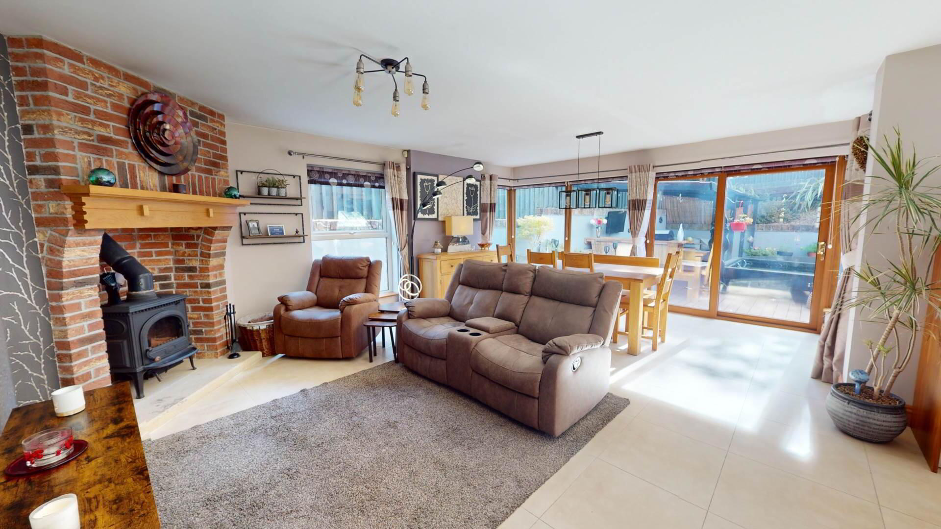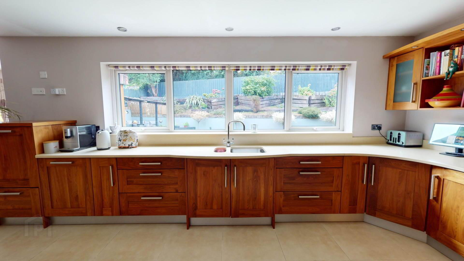 Inside, the bright open-plan kitchen, living with stove, and dining area through sliding doors, draws you to the peaceful rear garden. The custom Greenhill kitchen impresses with a Rangemaster oven/stove and separate utility. Downstairs is complete with the front large sitting room with open fireplace, downstairs bedroom and toilet. Upstairs, find four spacious double bedrooms, two with sleek ensuites, plus a stylish family bathroom.