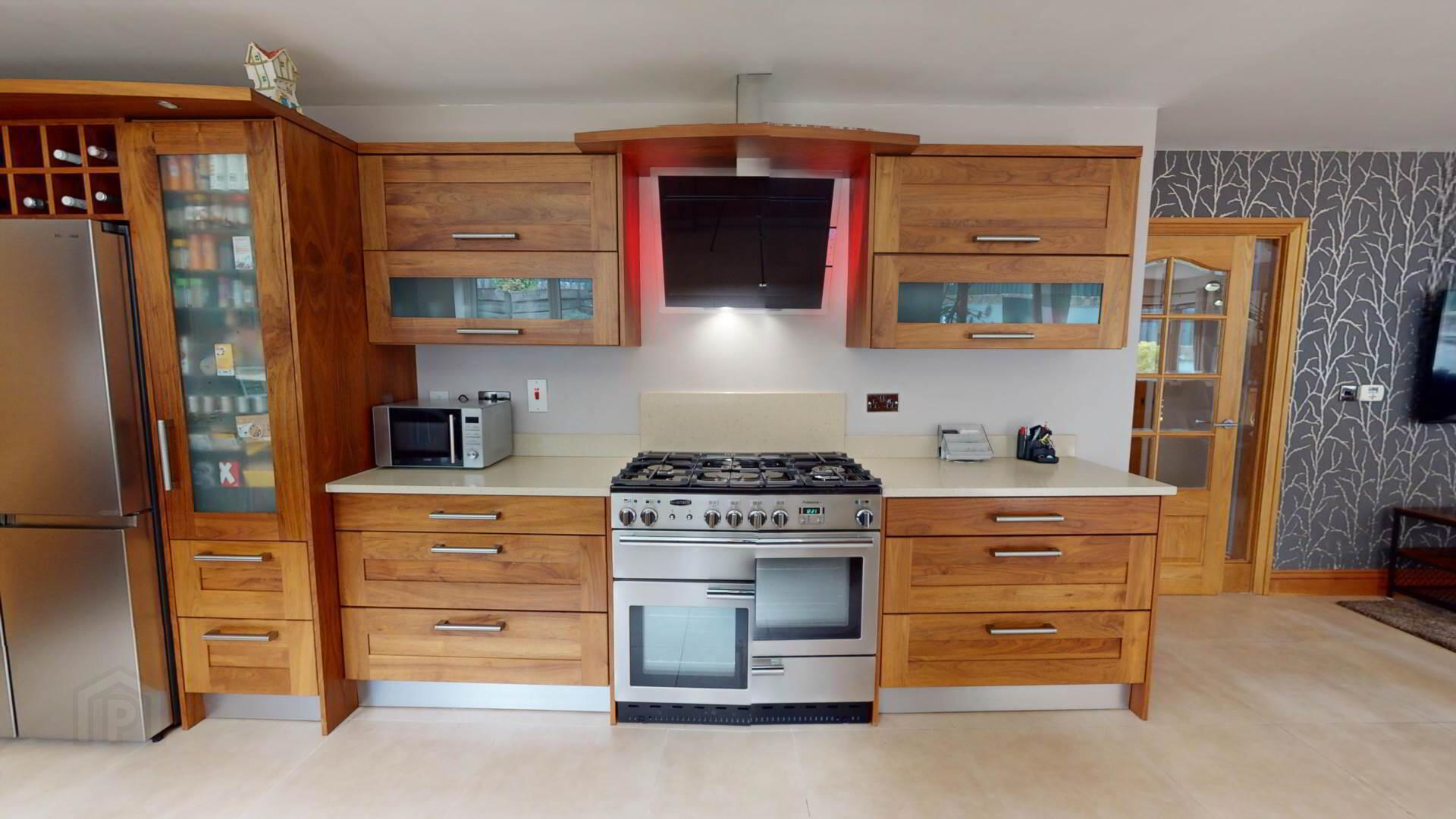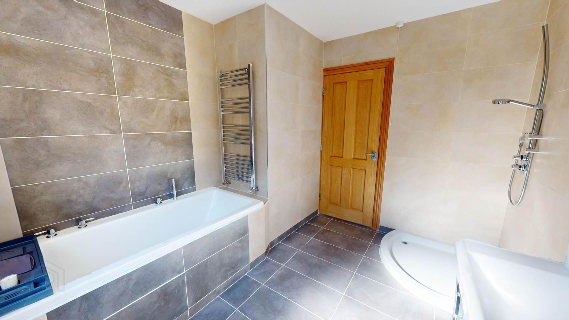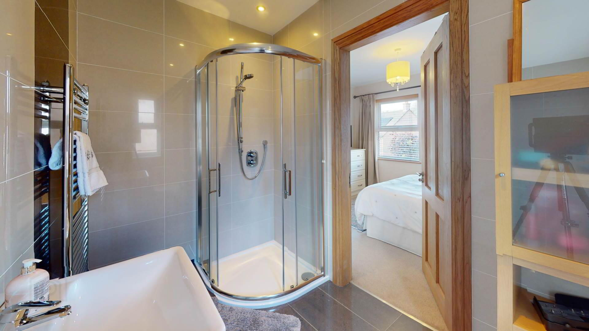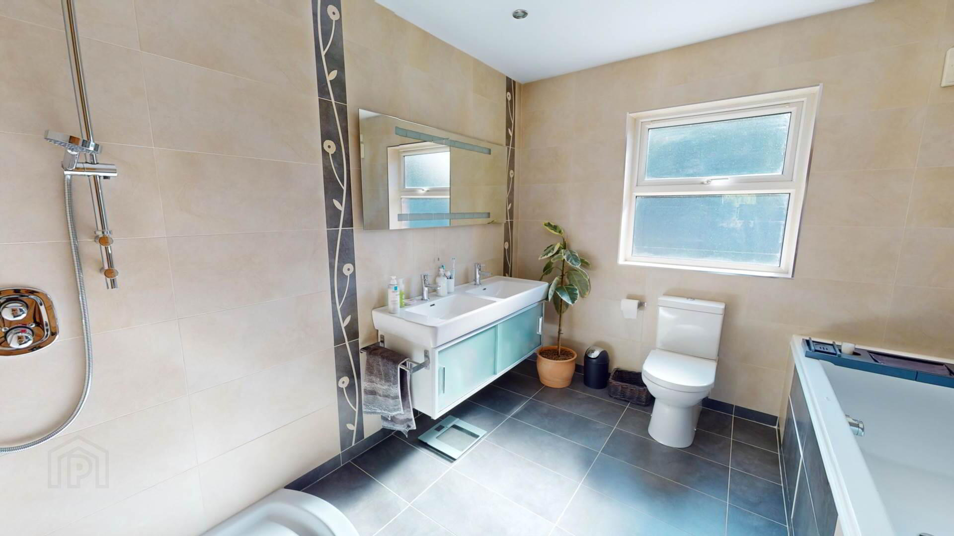 Inside, the bright open-plan kitchen, living with stove, and dining area through sliding doors, draws you to the peaceful rear garden. The custom Greenhill kitchen impresses with a Rangemaster oven/stove and separate utility. Downstairs is complete with the front large sitting room with open fireplace, downstairs bedroom and toilet. Upstairs, find four spacious double bedrooms, two with sleek ensuites, plus a stylish family bathroom.