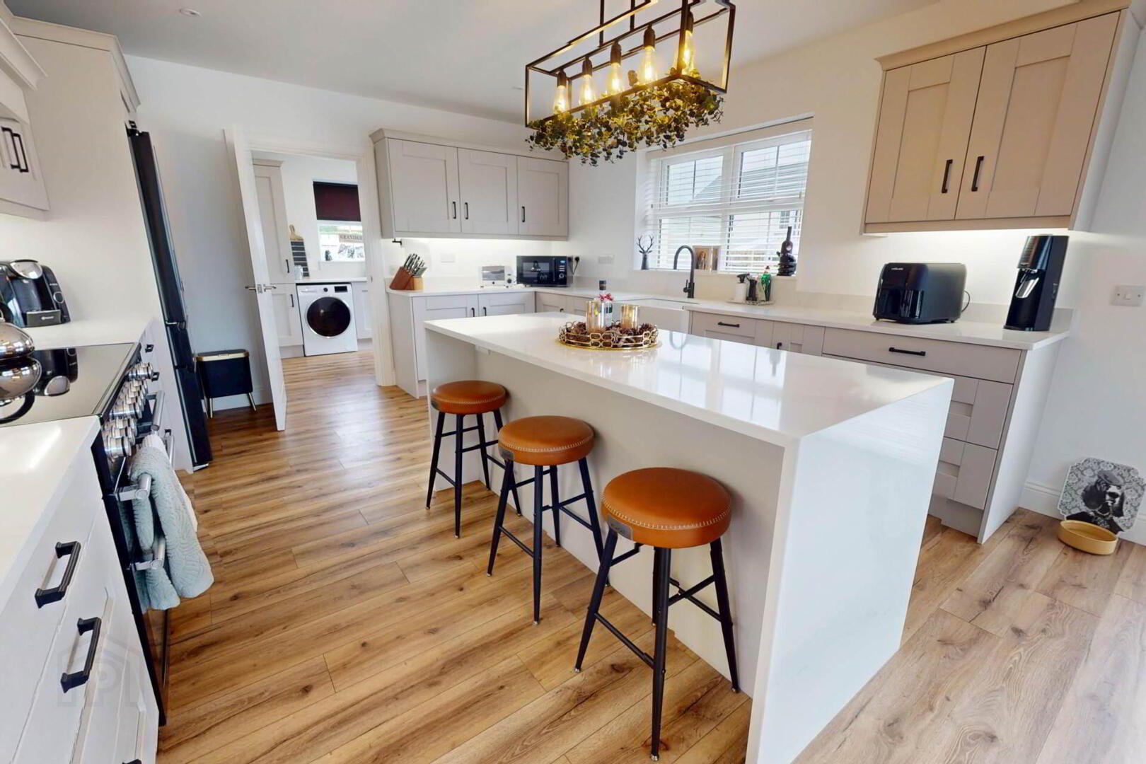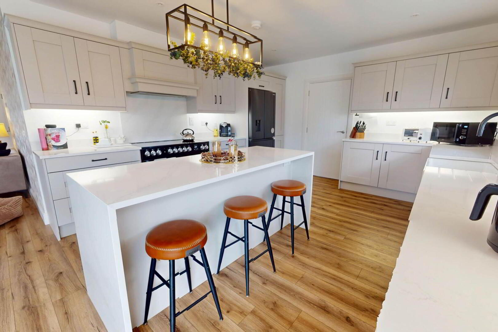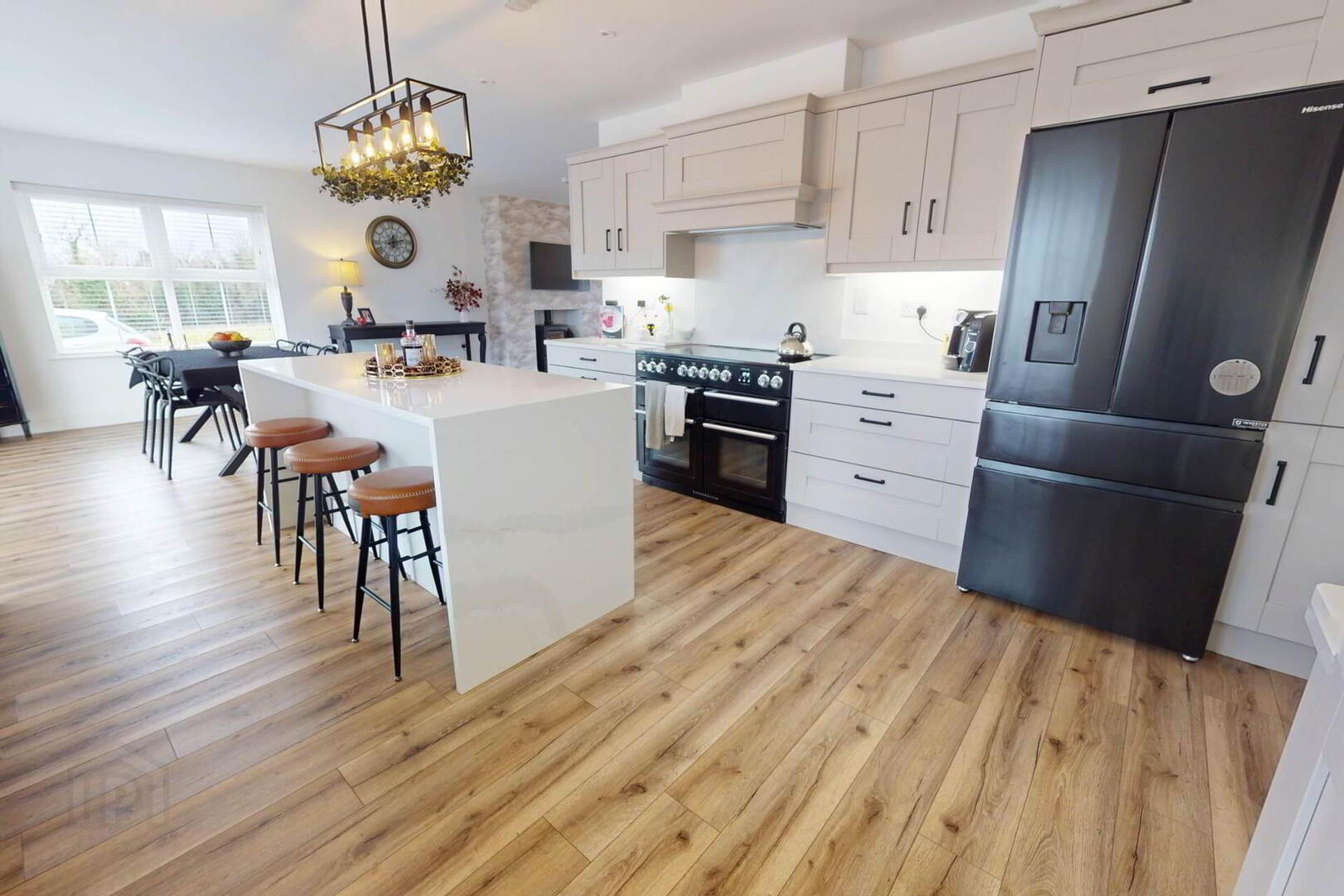 The bright front living room is centred around a modern wood burning stove, while the open plan kitchen/living/dining space offers a second stove and a high end kitchen with quartz worktops, a double-sided waterfall edge island, and seamless flow to the garden, finished with a separate utility room and WC.