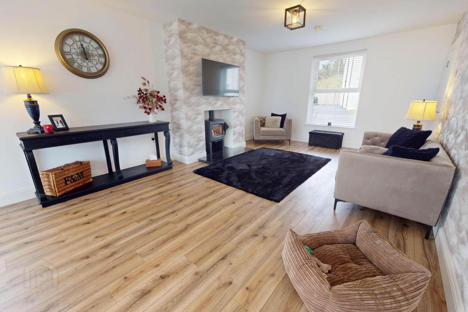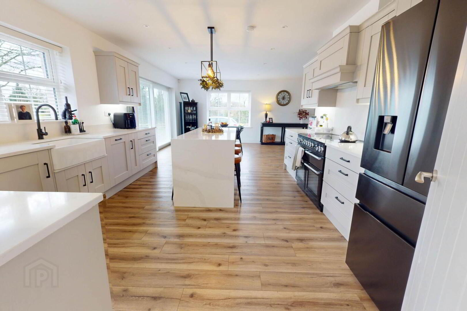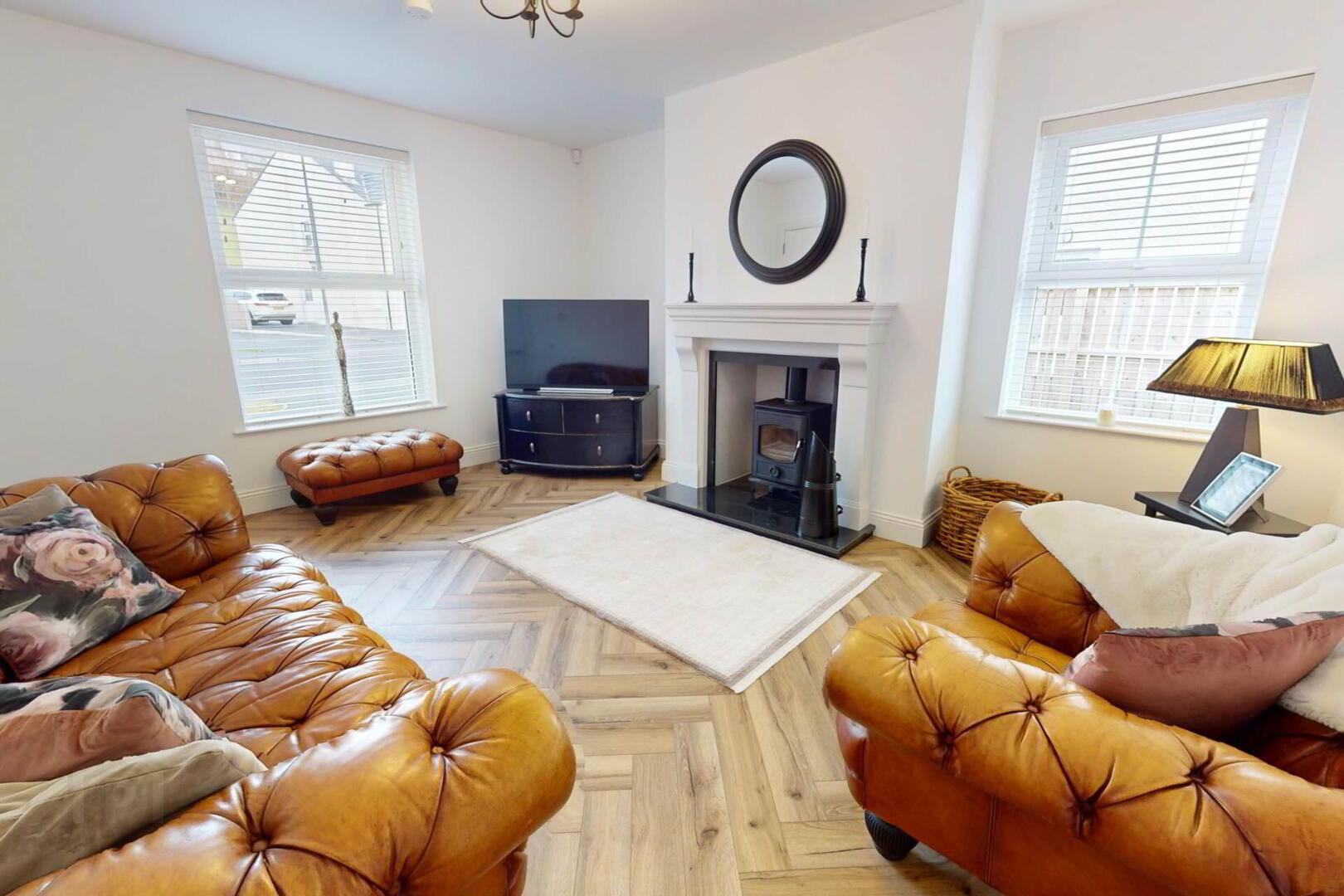 The bright front living room is centred around a modern wood burning stove, while the open plan kitchen/living/dining space offers a second stove and a high end kitchen with quartz worktops, a double-sided waterfall edge island, and seamless flow to the garden, finished with a separate utility room and WC.