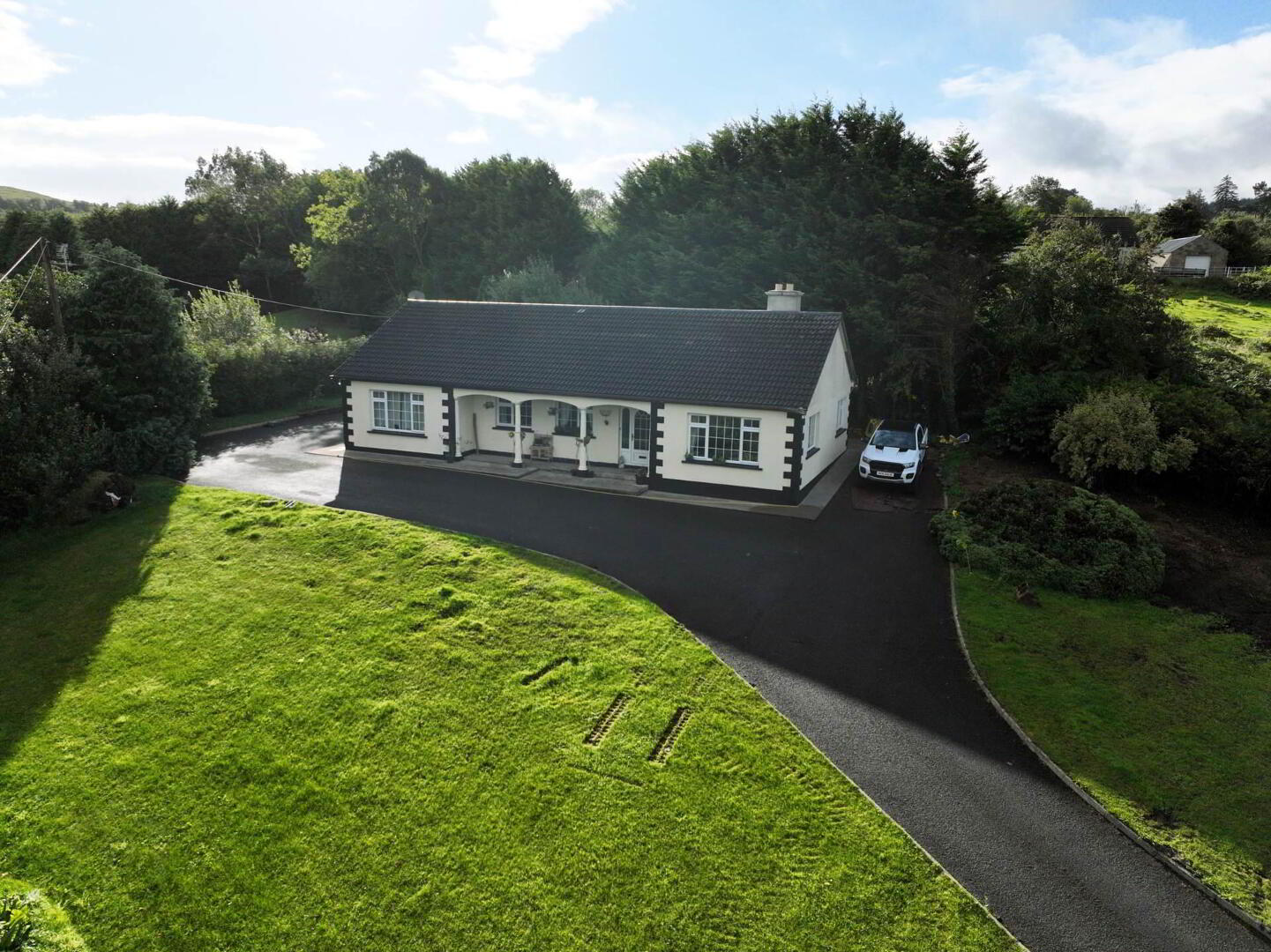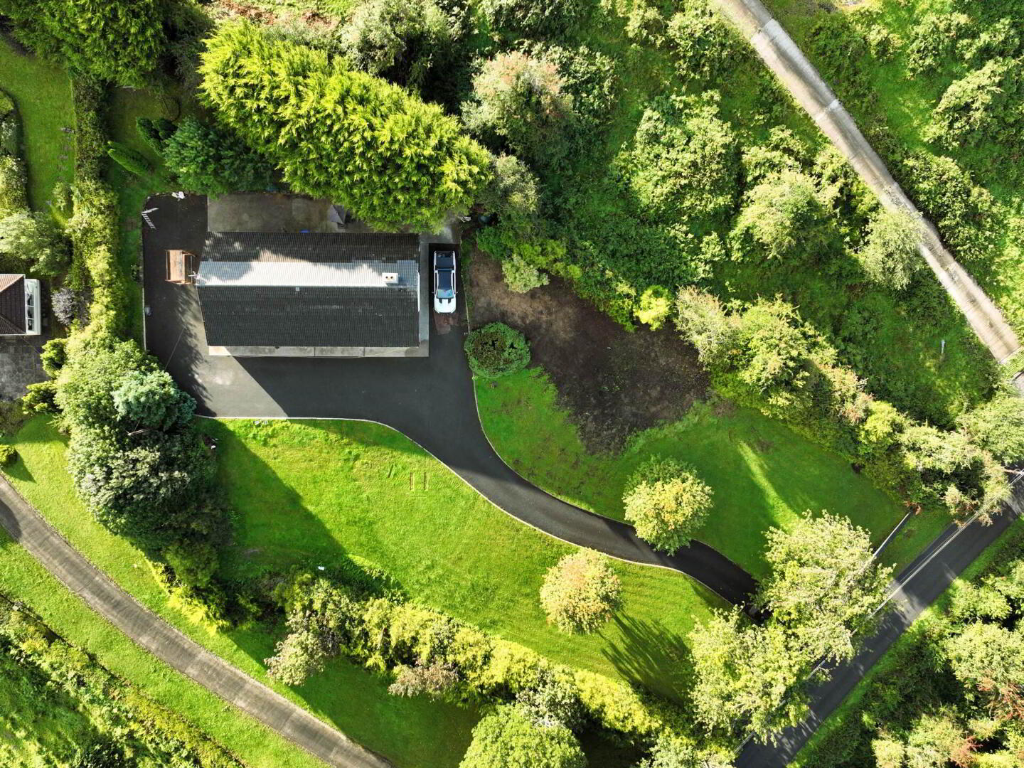 Set on a generous site with mature trees and a long tarmac driveway, the property offers excellent privacy, ample parking, and easy access all around.