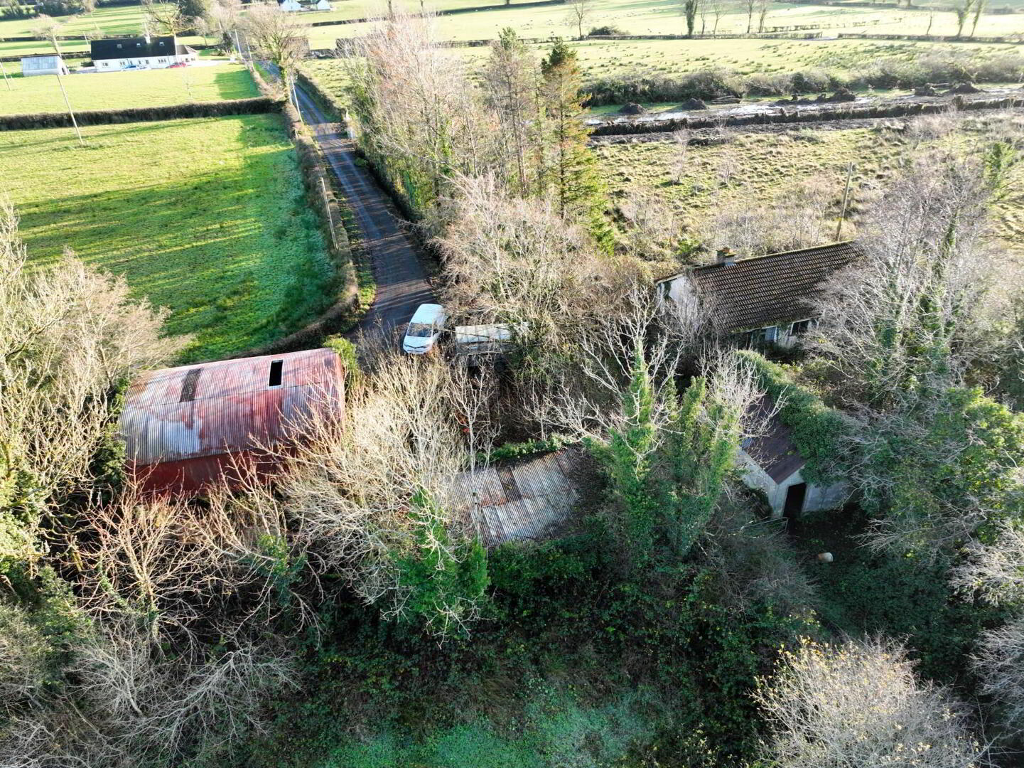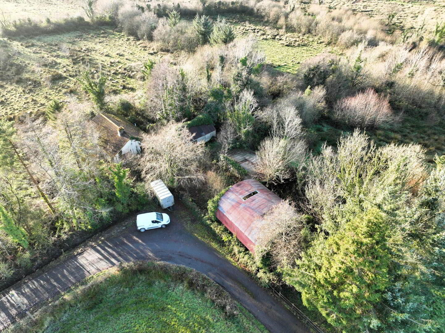 Positioned within the holding is a derelict 2 bedroom bungalow together with a hayshed. The bungalow is in poor condition and, to the best of our knowledge, it does not currently benefit from planning permission. Nonetheless, the presence of an existing structure may offer a basis for discussions with planning authorities, subject to policy and approvals.
