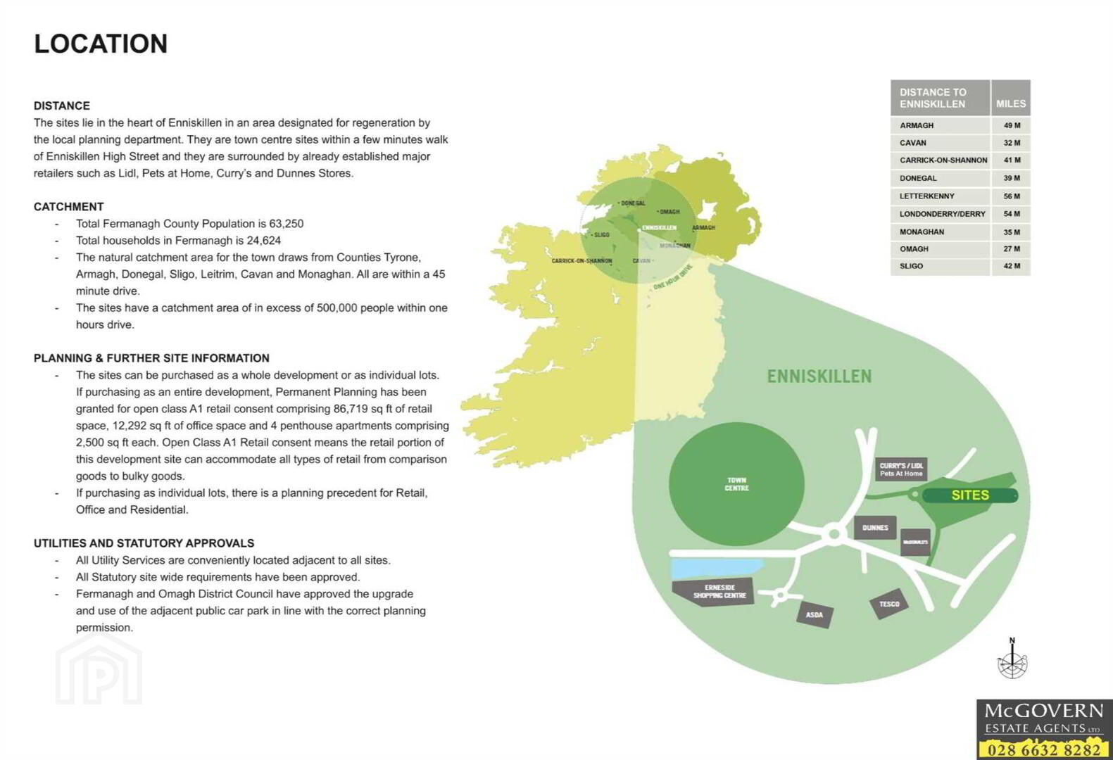 Within the town centre and only a few minutes walk from Enniskillen High Street, the sites lie in the heart of Enniskillen town centre in an area designated for regeneration by the local planning department and surrounded by already established major retailers such as Lidl, Pets at Home, Curry`s and Dunnes Stores.